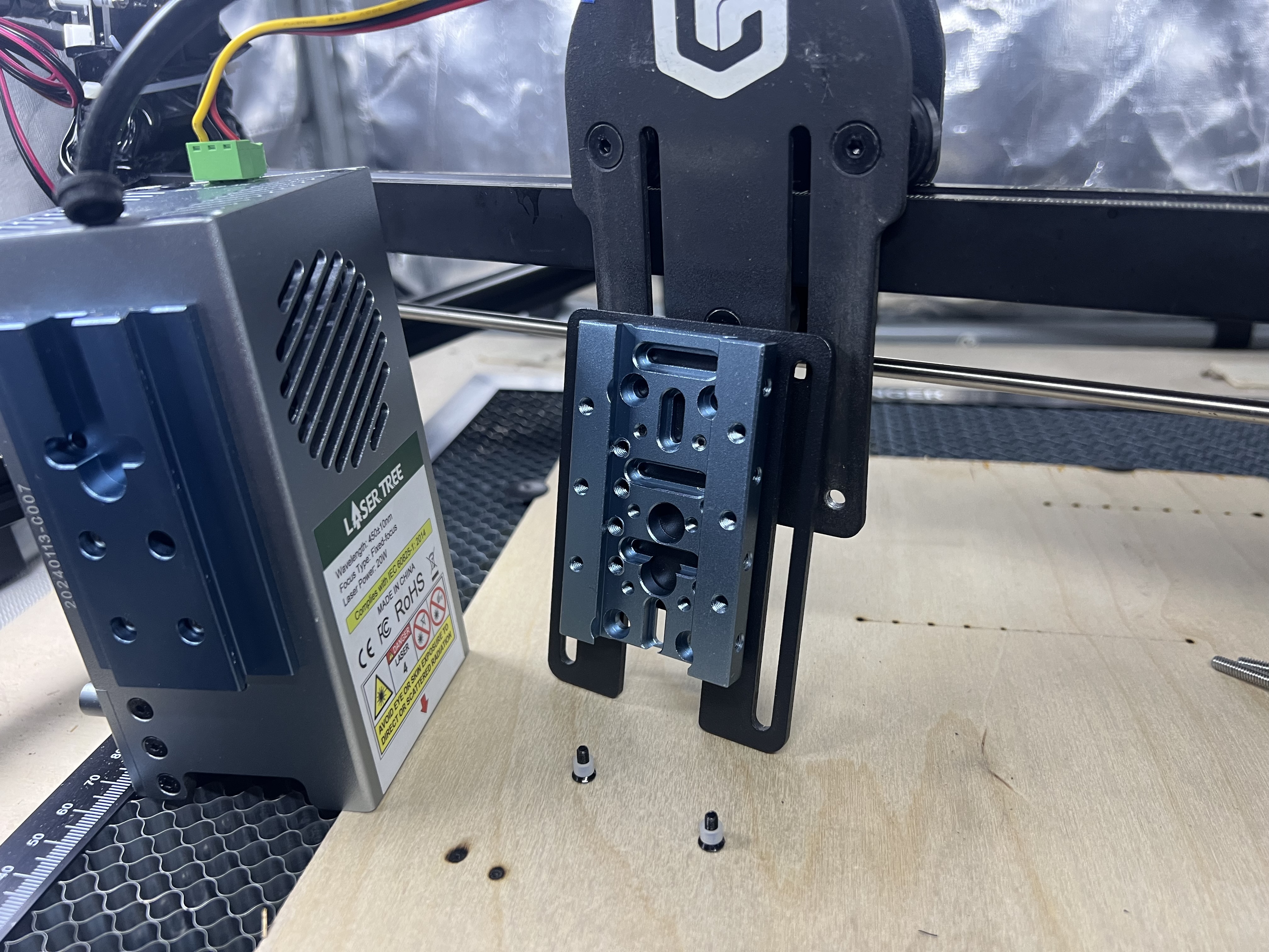 Photo below shows after the OEM Longer Ray5 thumb screws have been installed and the Laser Tree slide adapter is now attached fully to the Longer Gantry…