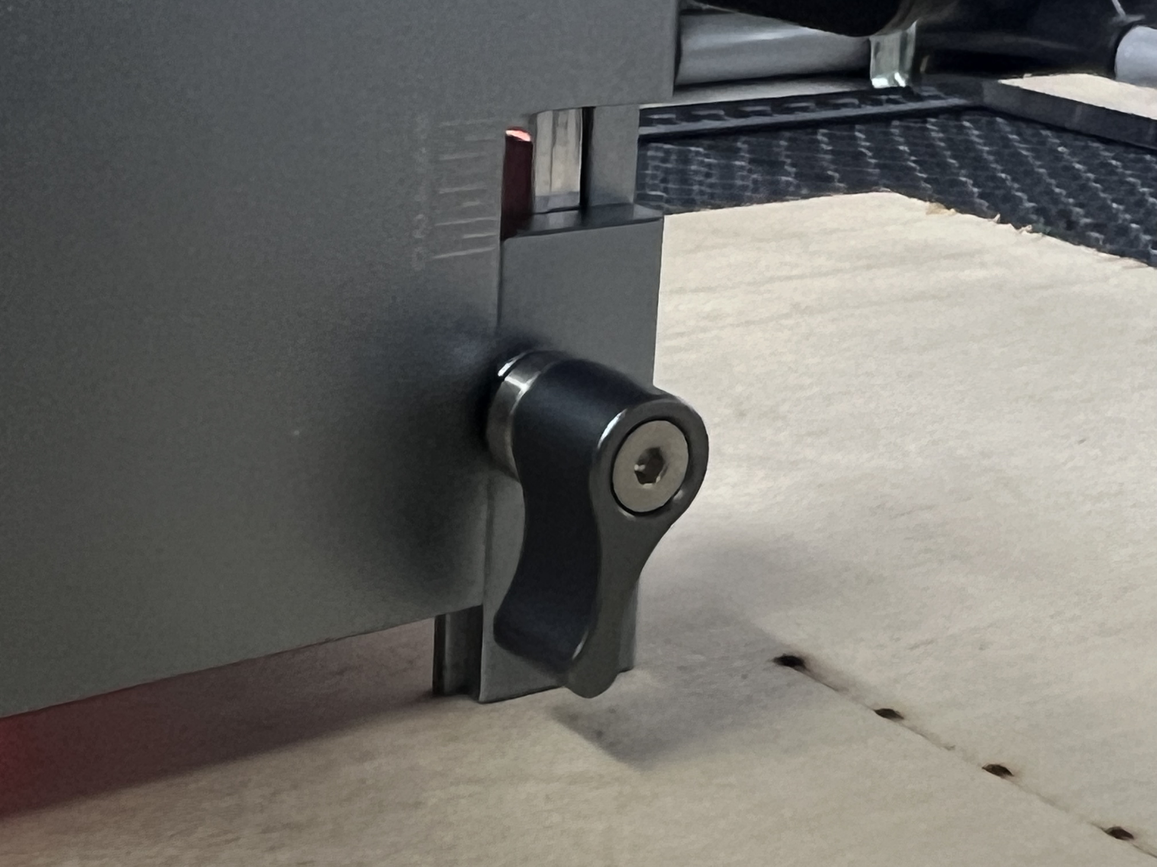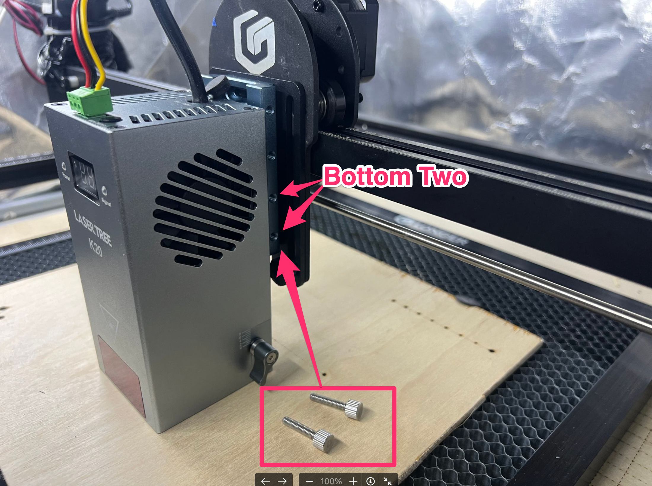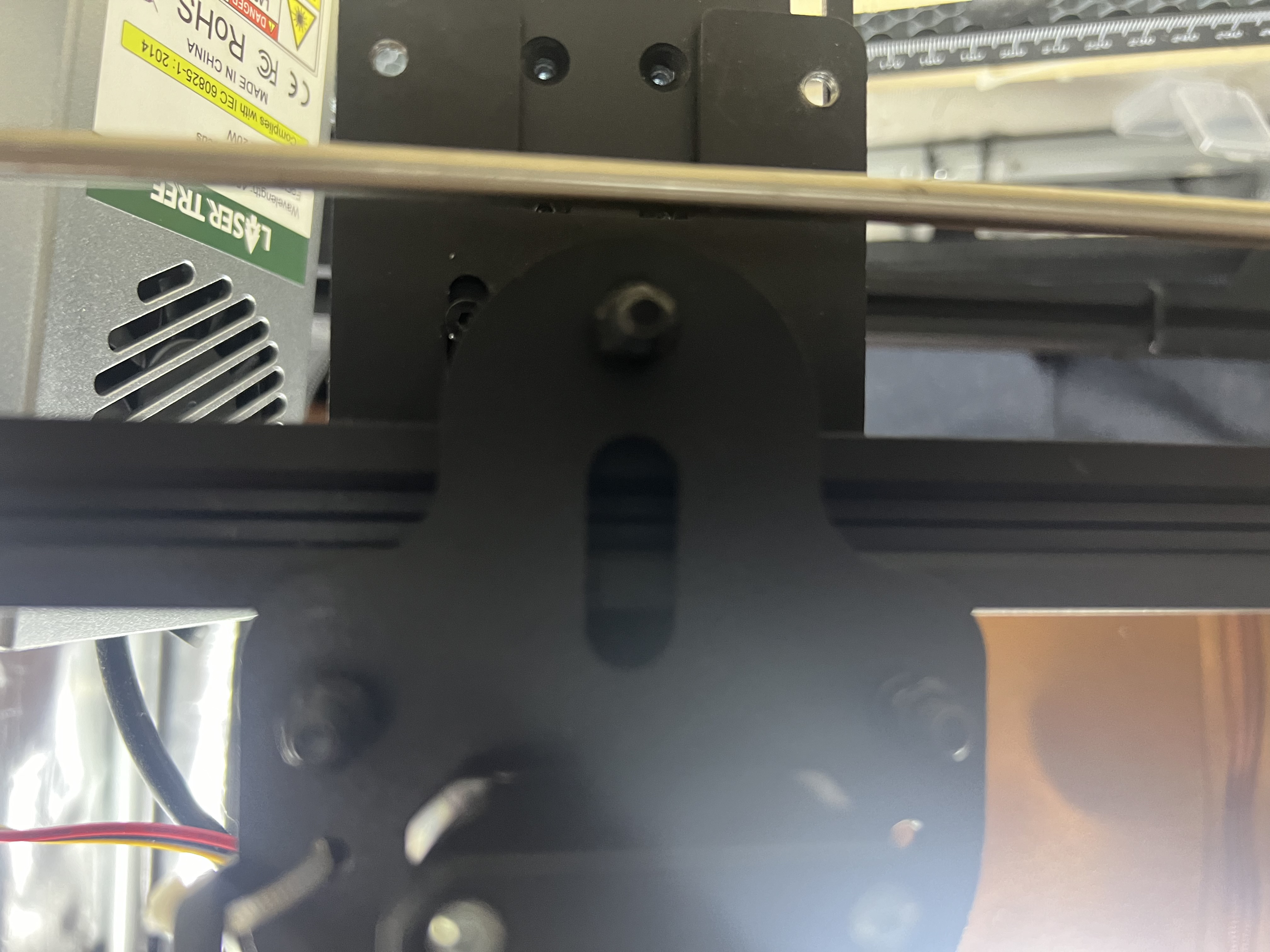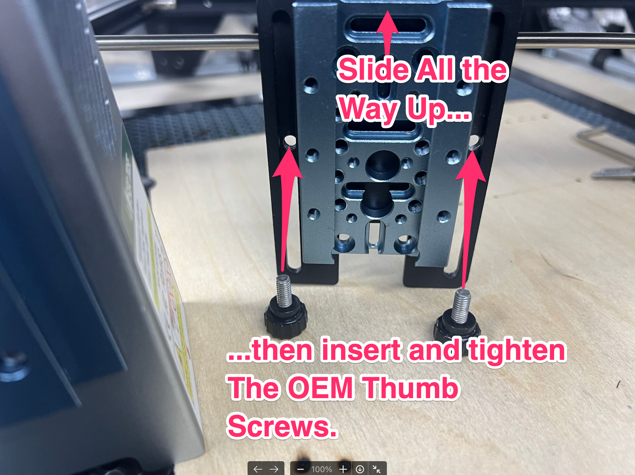To insert the thumb screws, the OEM plate needs to be slid all the way to the top so there is space to insert the thumb screws. If these were smaller bolts, perhaps the OEM slide wouldn’t need to be all the way at the top, however, in order to use all of the OEM parts that come with the Longer Ray5 engraver, I’m showing how to do it with the thumb screws.