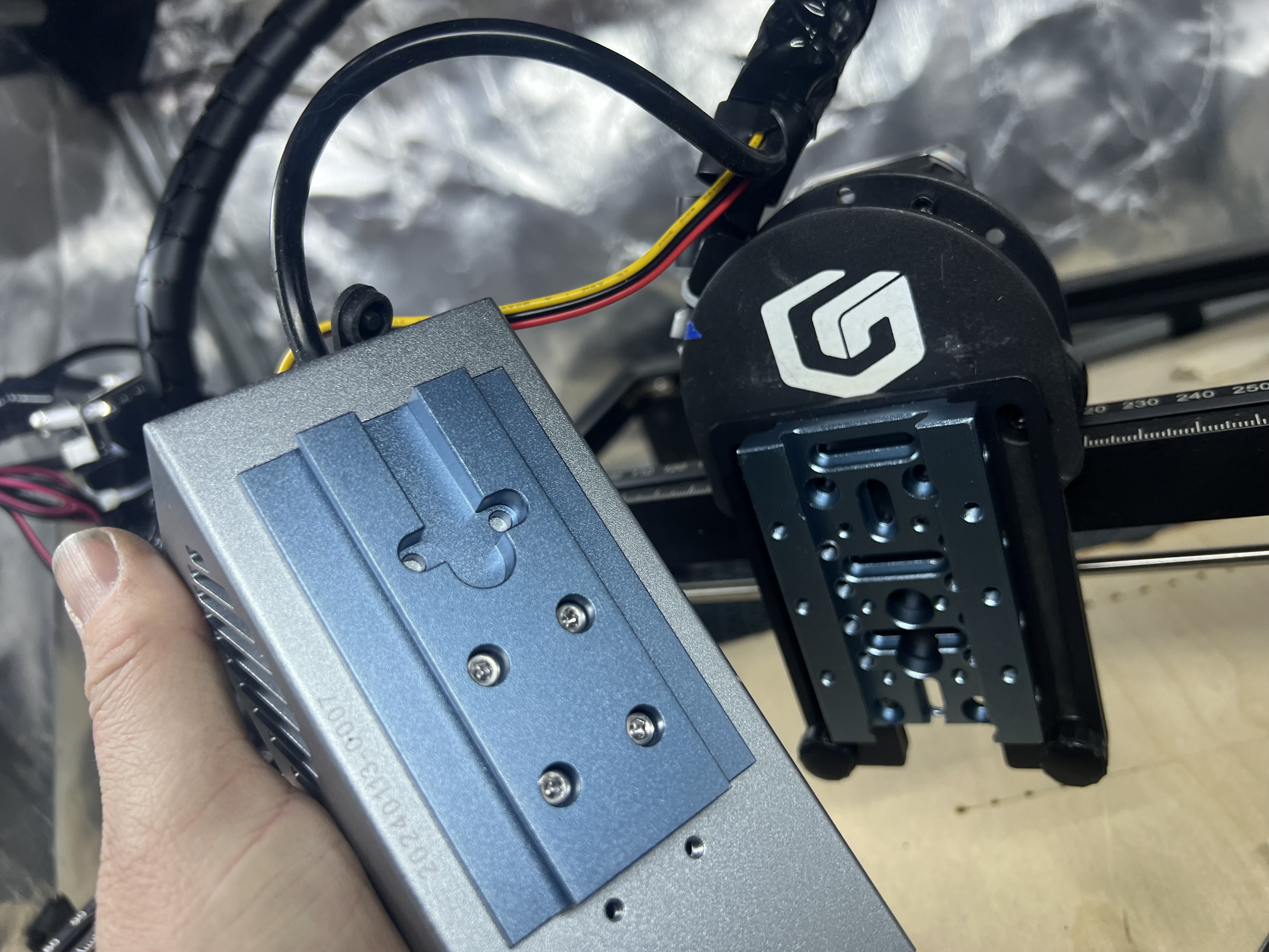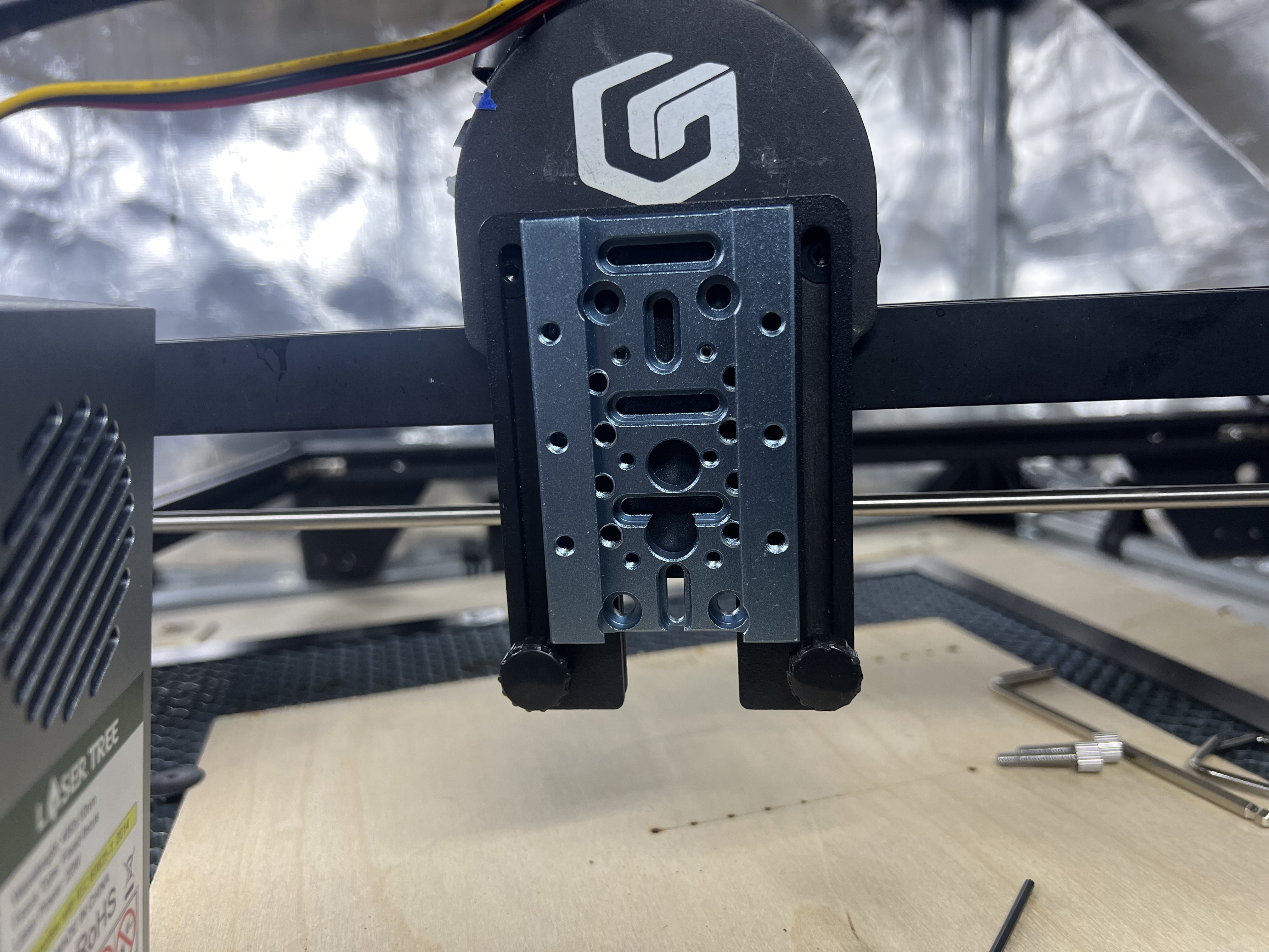 Using 4 of the machine screws that were holding the original Longer Laser module to the Longer slide plate, after removing the OEM slide plate from the back of the OEM Longer laser module, attach the Laser Tree adapter as shown below.